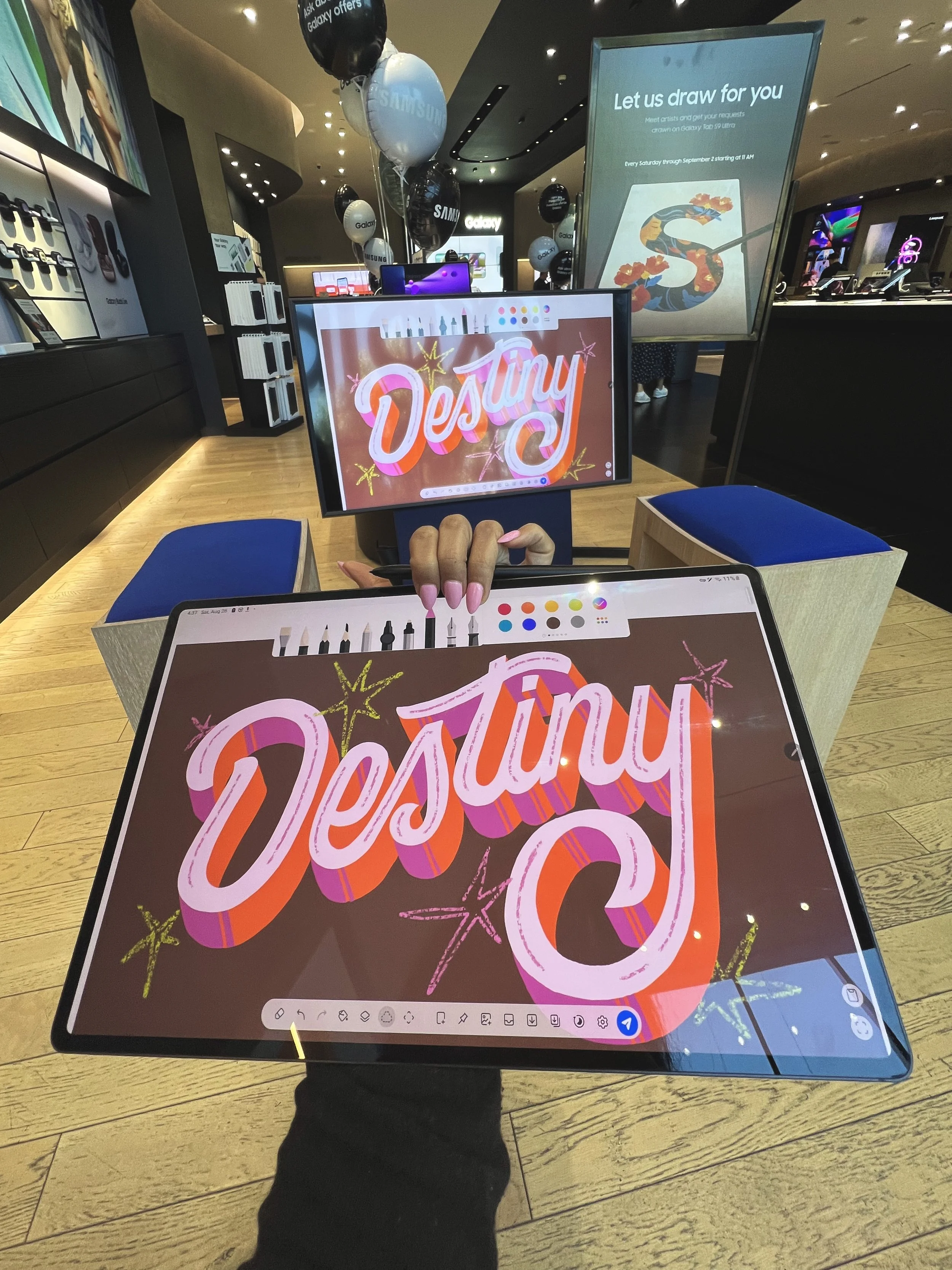 In 2023, I had the exciting opportunity to partner with Samsung for an in-store live demo featuring their new tablet. While I’m best known for my hand-painted art and live lettering at events, this collaboration let me showcase a different side of my work—drawing digitally using tech-forward tools.